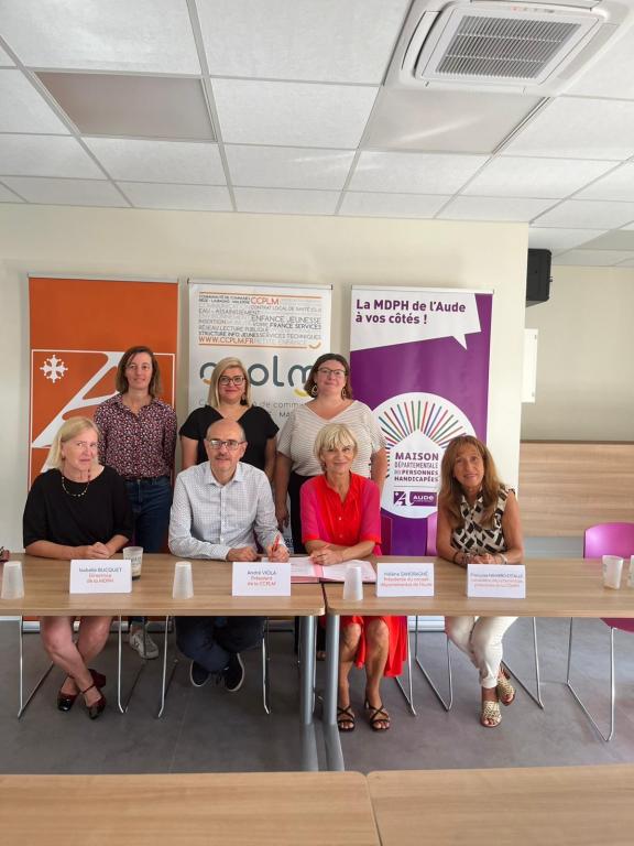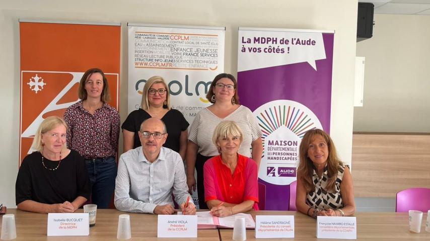 Une convention de partenariat signée ce lundi 15 septembre entre la Maison départementale des personnes en situation de handicap (MDPH) de l'Aude et la Communauté de communes Piège Lauragais Malepère (CCPLM) vient renforcer l’accès aux droits pour tous. Grâce à elle, des agents d'accueil vont être formés afin de pouvoir répondre au mieux aux besoins de ce public. L'officialisation s'est faite en présence de la présidente du conseil départemental, Hélène Sandragné, et du président de la CCPLM, André Viola, ainsi que de Françoise Navarro, conseillère départementale déléguée au handicap et présidente de la Commission des droits et de l'autonomie des personnes handicapées.