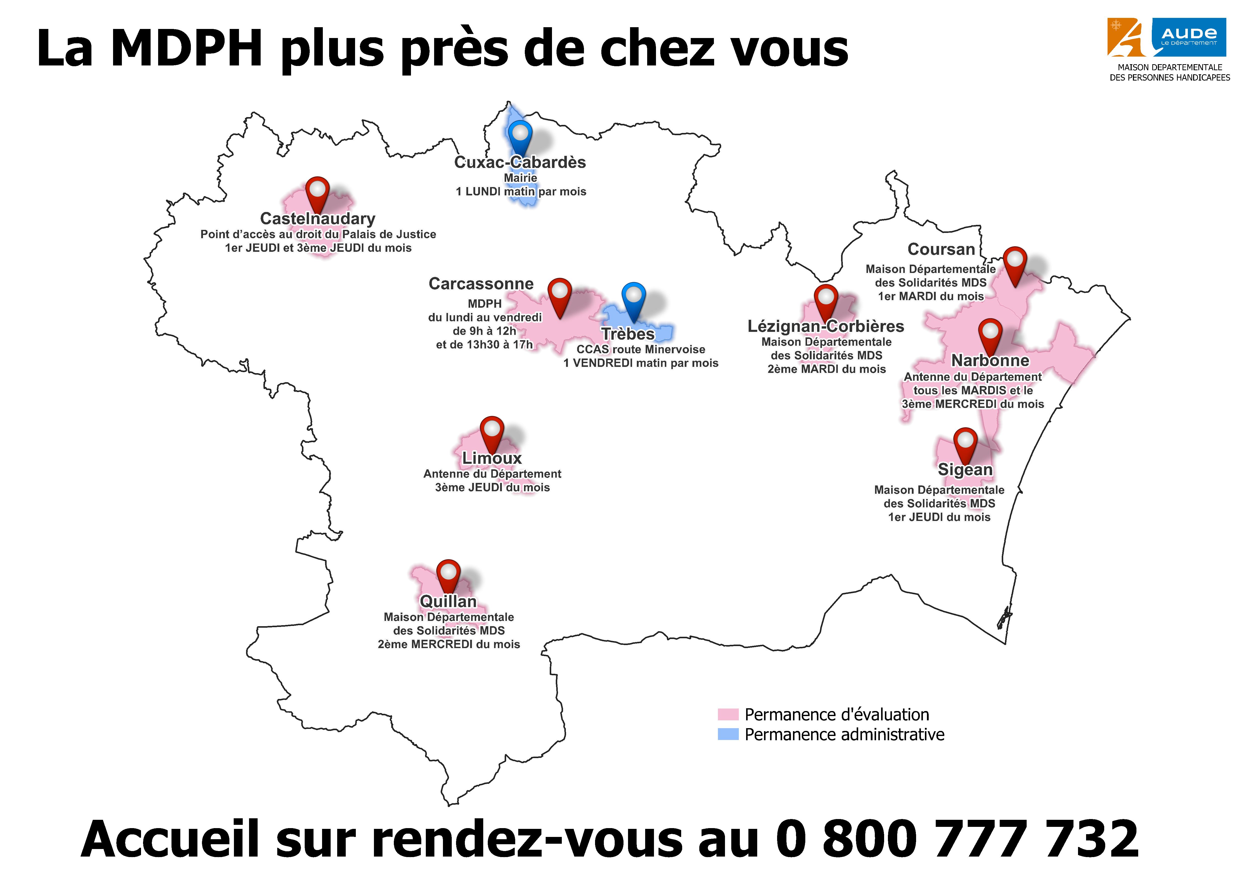 En 2021, la MDPH a mis en place 7 permanences dans les Maisons départementales des solidarités de Limoux, Quillan, Sigean, Lézignan, Coursan, au point d'accès au droit du Palais de Justice à Castelnaudary et à l'antenne du Département de Narbonne. 2 permanences administratives sont organisées sur Trèbes et Cuxac-Cabardès. Cela a permis à la MDPH de se rapprocher des personnes handicapées et de faciliter leurs déplacements, notamment pour le rendez-vous prévu dans le cadre de l’évaluation de leur demande de Prestation de compensation du handicap (PCH).
